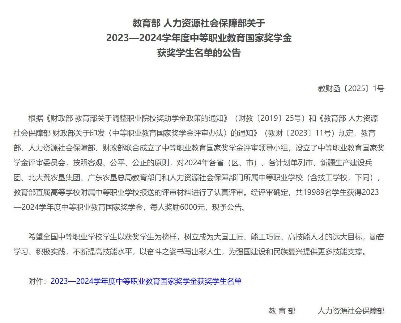 近日,教育部、人力资源社会保障部公布了2023-2024学年度中等职业教育国家奖学金获奖学生名单。全国共19989名学生获得此项每人奖励6000元的奖学金荣誉。我校李雪莉、李姿燕、霍梦雪3名同学获此殊荣。